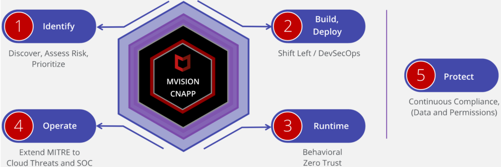 MVISION CNAPP brings application and data context to uniquely converge Cloud Security Posture Management (CSPM) for public cloud infrastructure, and Cloud Workload Protection (CWPP) to protect hosts and workloads including VMs, containers, and serverless functions. MVISION CNAPP provides five key capabilities: